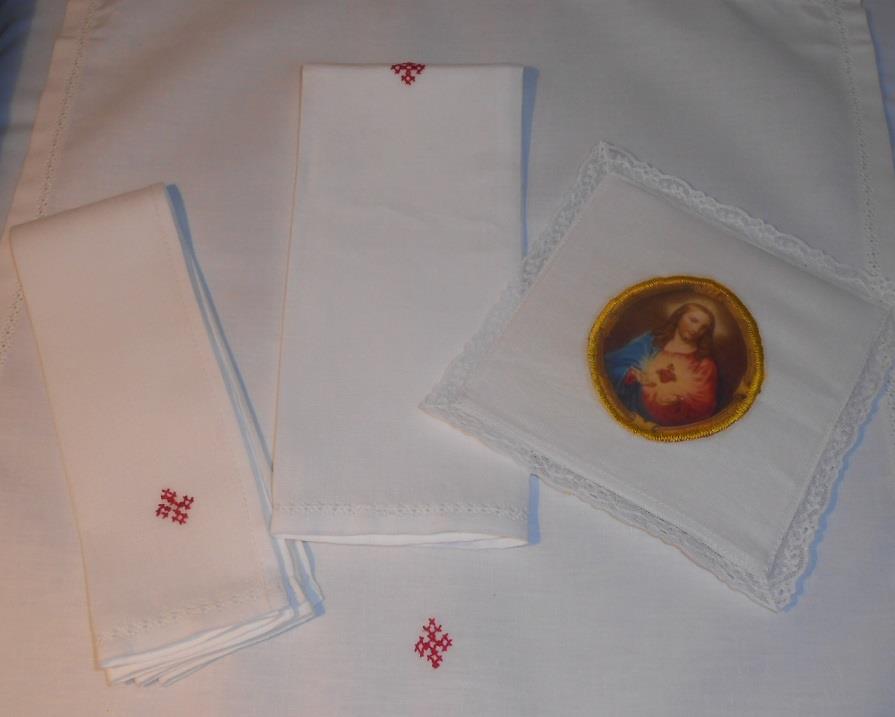 Handmade pure linen Amices made to Catholic rubrical requirements. Traditional liturgical Mass Linens crafted for reverence, durability, and proper use at Mass. Hand embroidered Cross and cotton tie tapes. (Note: Lace edging show in image is an additional Option available in a separate product listing).
